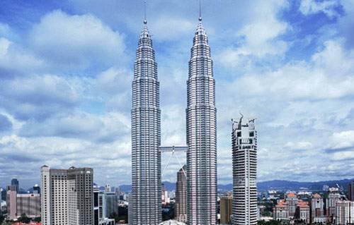 1996年建成的高450m的馬來西亞雙塔石油大廈;